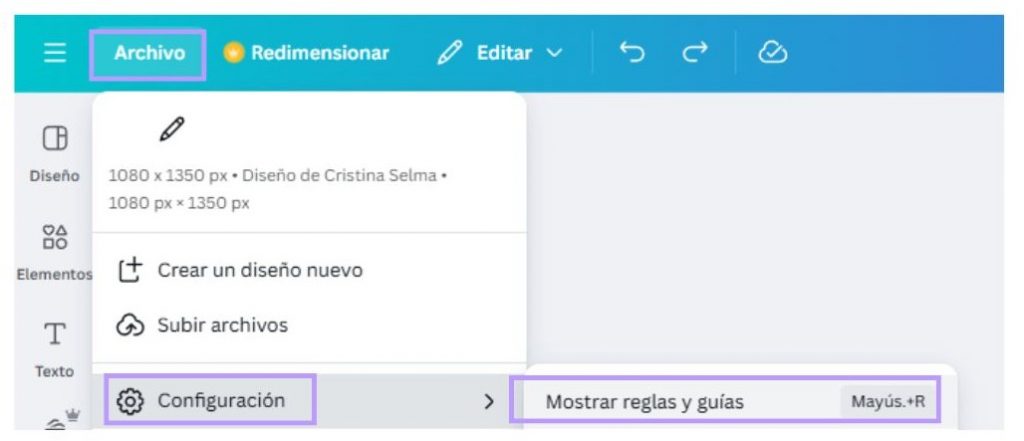 Tip: si ves que Canva no te muestra estas líneas, asegúrate de tener activadas las guías inteligentes desde el menú de “Archivo”
